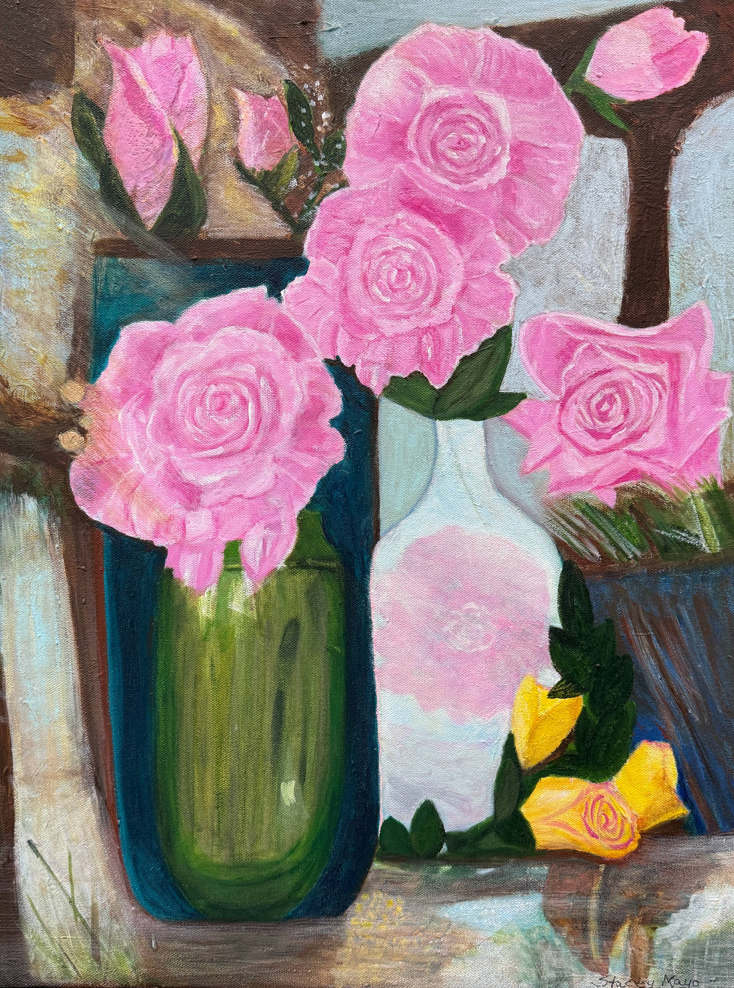 NEW ORIGINAL PAINTING: 11 ROSES We are excited to share Stacey’s newest original painting, “Eleven Roses. It is 18 x 24” on gallery wrapped canvas with the scene continuing around its edges, inviting you to experience it from every angle. (No frame is needed.) This painting is full of symbolism, beauty and whimsy. The pink roses represent aspects of self-love in various stages of growth and the bottle of rosewater is for reducing stress and anxiety (especially important in these times.)The...